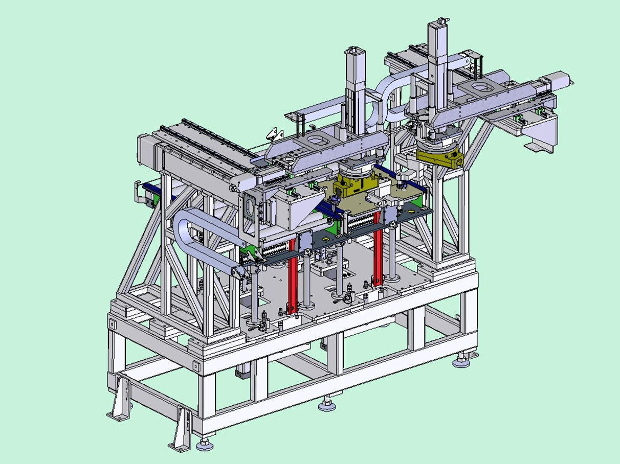こちらは自動機・ロボット導入/部品加工・調達代行 Naviを運営する佐々木精工が設計・製作したエンジンケースを搬送するためのエンジンケース移載機です。 この自動機は、カメラによる補正のラインと、専用チャックが各2列あり先に挙げた事例と比較して搬送数量などの面でより効率化が進んでいる自動機と言え、エンジンケースの加工機間を搬送するための移載装置で、本装置はカメラによる位置補正を行い、専用チャックでチャッキングし、取り出し、パレットへの整列を行う仕様となっています。