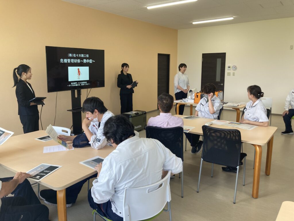 9月1日は防災の日でした。豊後高田市消防本部の隊員を招き胸骨圧迫とAEDによる心肺蘇生方法の講習を受けました。救急隊が到着するまでの間に傷病者の蘇生に役立てるよう皆さん真剣に取り組みました。また、夏の猛暑日が続く中で発症しやすい熱中症の応急処置方法について、50S合同会社PROFILEを招いて講習をいただきました。体調の変化を察知して、素早く身体の冷却と水分補給をし、健康被害を防いでいきましょう。